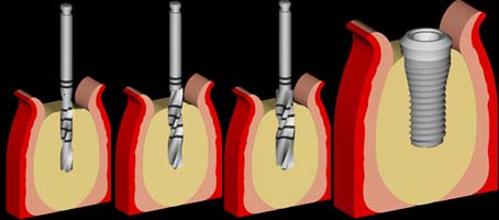 Het tandvlees wordt op de plek waar het implantaat komt, losgemaakt en opgeklapt, waardoor het kaakbot zichtbaar wordt. Vervolgens wordt een gaatje in het kaakbot geboord. De eerste boor, die gebruikt wordt is smal, de volgende boor is echter iets breder, dit wordt herhaald totdat het boorgat breed genoeg is om het implantaat erin te draaien. De boren worden gekoeld met infuusvloeistof wat een beetje zout smaakt. Het tandvlees wordt met behulp van hechtingen weer gesloten, mochten meer implantaten worden aangebracht dan zullen deze bijna altijd tijdens dezelfde behandeling worden ingebracht.