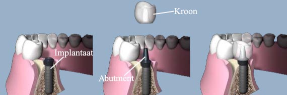 Voor een kroon of een brug wordt er vaak een opbouw op het implantaat vastgedraaid, deze opbouw wordt een abutment genoemd. De uiteindelijke kroon zal als een soort van dopje over het abutment heen worden vastgelijmd. Met dank aan een Japanse tandarts-implantoloog is er een flash animatie beschikbaar waar schematisch het principe in wordt duidelijk gemaakt: